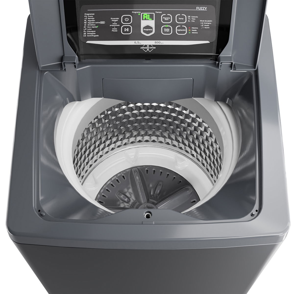 Lavarropas de carga superior. Su capacidad de lavado es de 6,5 Kg y su velocidad de centrifugado es de 800 RPM. Color gris. Eficiencia A+. Sistema oriental. Cuenta con Display LED digital y botones. Su tapa es de vidrio templado y su tambor de acero inoxidable. Posee alarma fin de lavado, selector de temperatura y de agitación. Su programa Fuzzy detecta el mejor programa de lavado según la carga de ropa y agua necesaria. Opción media carga y plancha fácil. Patas regulables. Origen Argentina.