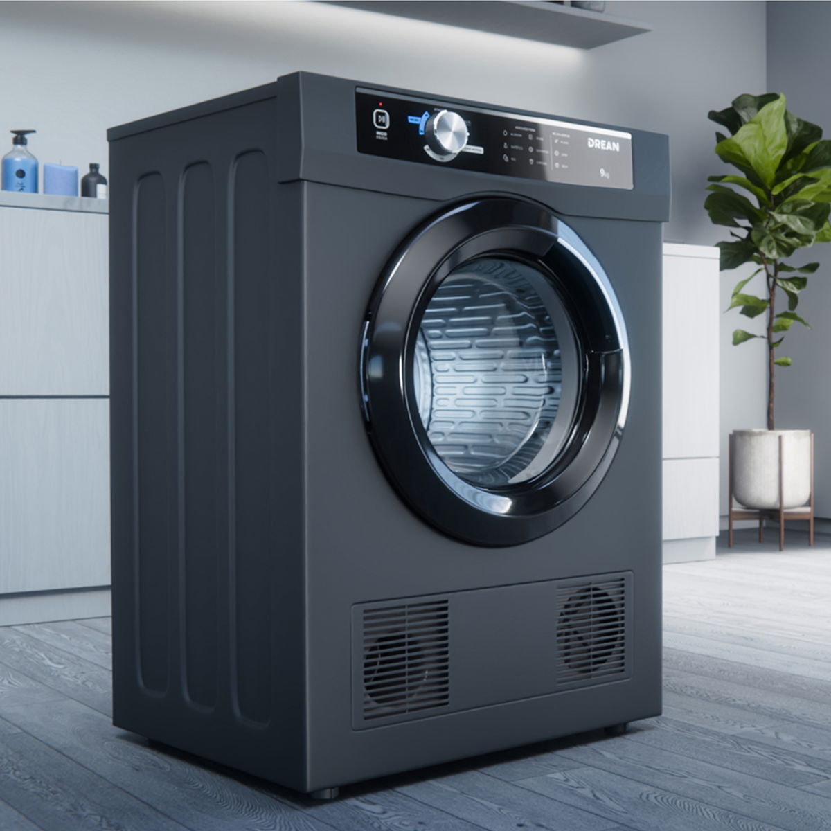 Secarropas por calor de carga frontal. Color gris. Capacidad de secado de 9 Kg. Tambor interior de acero inoxidable. Programas Air dry de 30 y 60’ con aire fresco, programa Auto que detecta los niveles de humedad en la ropa y detiene el proceso cuando las prendas están secas, y programas de secado por calor de 30, 60, 120 y 180’. Display LED con protección conformal coating y perilla. Tecnología Antiarrugas. Sistema de instalación dual con opción de salida de aire al exterior. Origen China.
