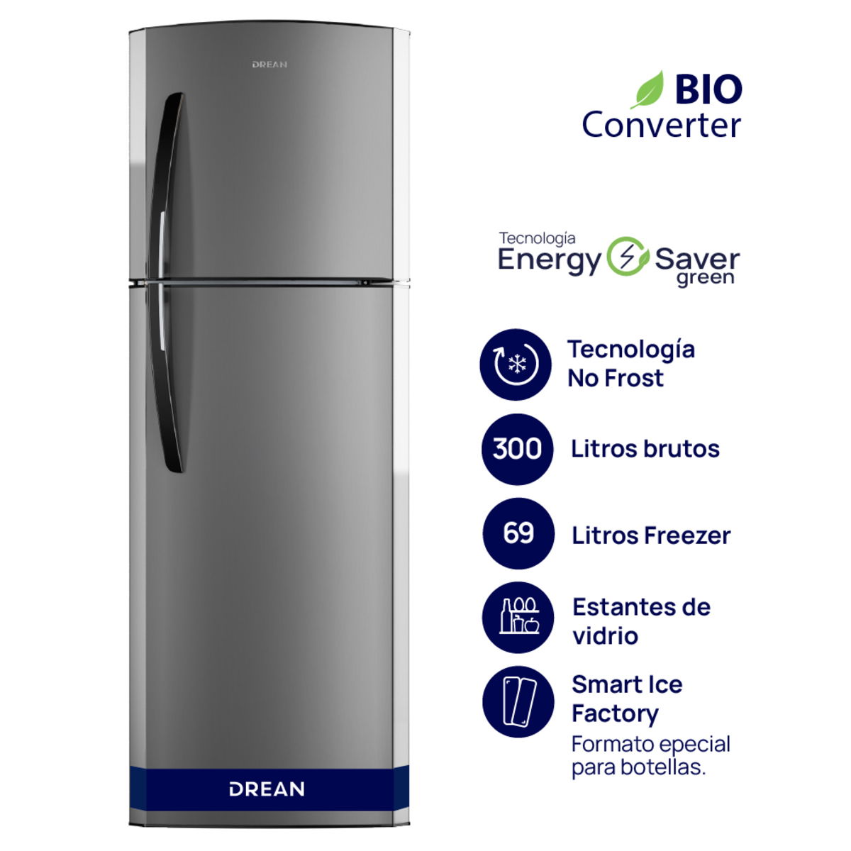 Heladera con freezer no frost. Eficiencia A. Color steel. Gas ecológico R600a. Sistema Total Fresh Flow para una mejor distribución del frío. Estantes de vidrio templado en refrigerador regulables en altura. Anaqueles en contrapuerta para botellas y alimentos en freezer y refrigerador. Smart factory ice. Cajón para delicados, crisper XXL para frutas y verduras. Tecnología Energy Saver Green. Control de temperatura interior. Sistema antihuellas. Apertura controlada. Luz LED. Origen Colombia.