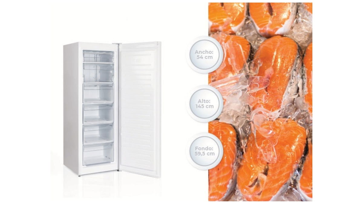 Ancho: 54 cm Alto: 145 cm Fondo: 59,5 cm Peso: 66 kg Capacidad: 200 Its Clase climática: T/N Ef. Energética: A +
