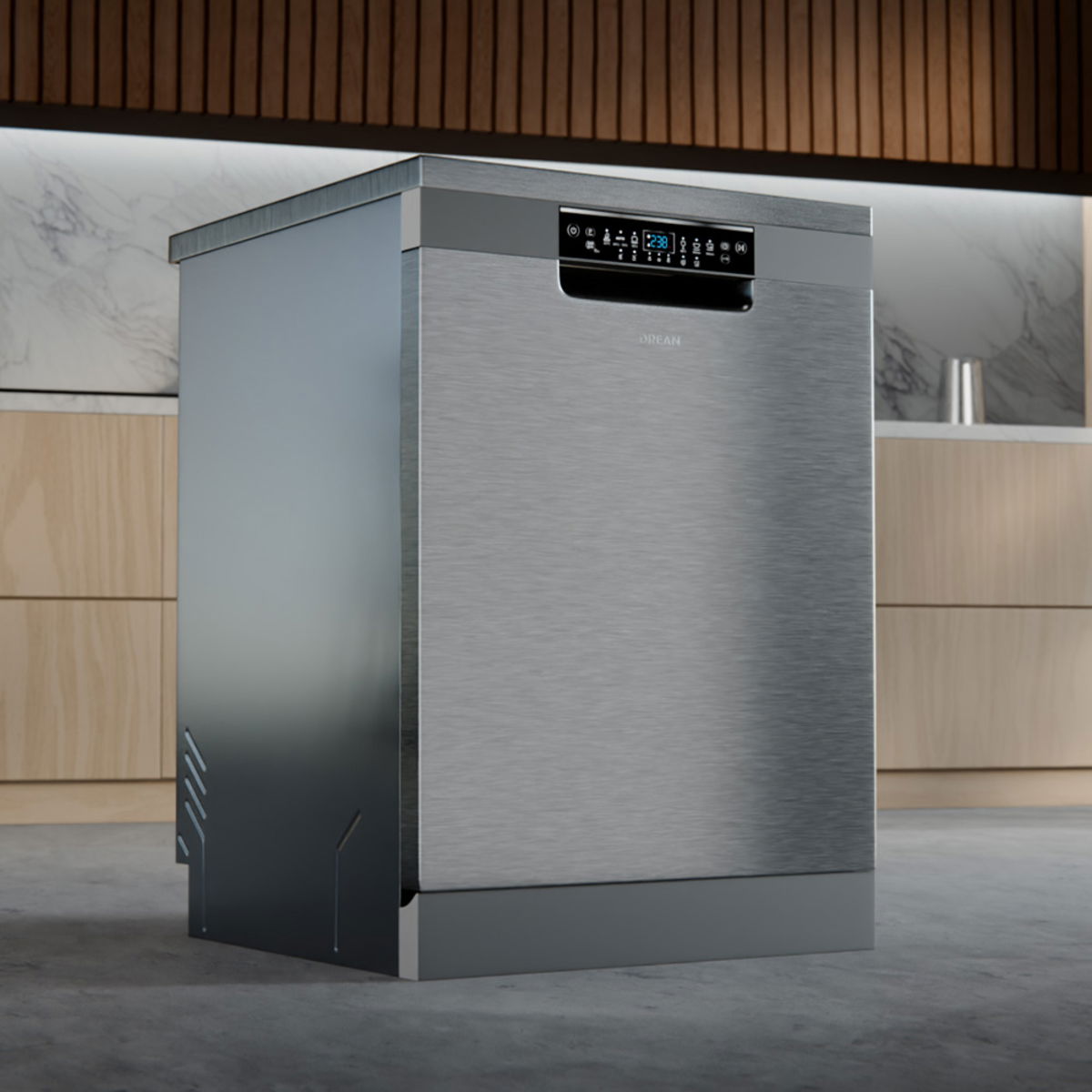 Lavavajillas con capacidad de lavado de 15 cubiertos. Color inoxidable. Eficiencia A+. Cuenta con 2 cestos separadores y 1 bandeja para cubiertos. Display LED con Soft touch control. Posee 6 programas de lavado: Automático, Pesado, Eco, Normal, 60’ y Vidrio. Funciones: Intensivo (70°), Media carga, Secado +, Desinfectante. Sistema Auto Wash Sensing con sensores que detectan el nivel de suciedad y programan el lavado ideal. Inicio diferido hasta 24hs. Apertura automática de puerta. Origen China.